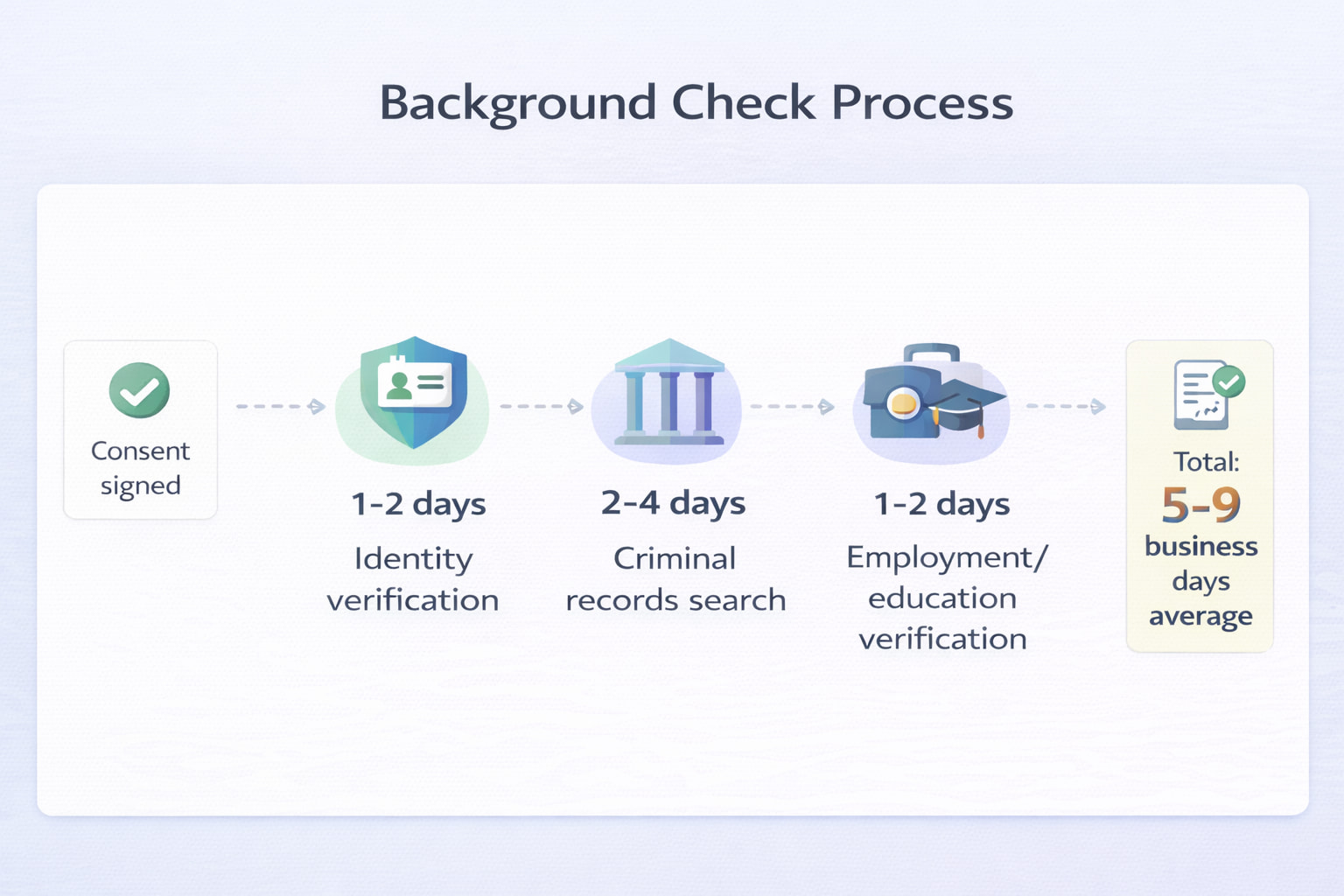 ! how long does it take to get a background check for jobs is typically under a week for most standard checks. if they’re checking multiple states or doing federal searches it might take 10-14 days. the process involves searching court records, verifying employment/education, and compiling everything. delays are common and usually don’t mean anything negative - just slow court systems or unresponsive previous employers