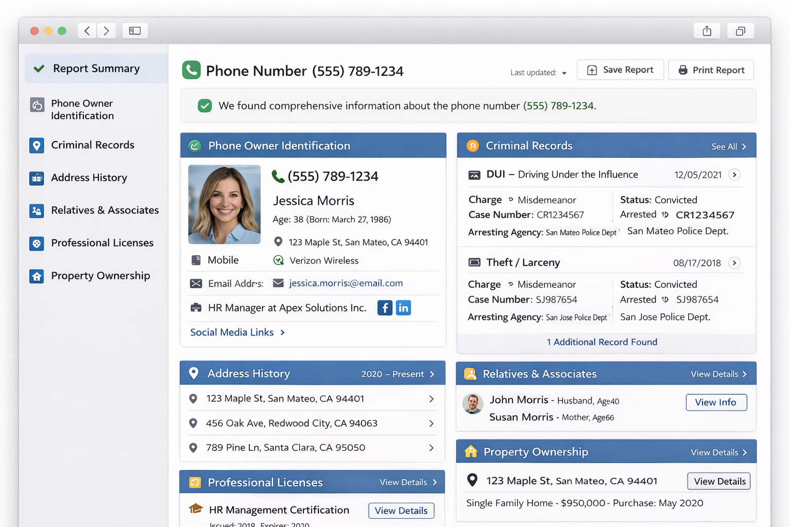 Employment/Education: ✓ Job titles, dates, employers you listed ✓ Degrees and schools you claimed ✓ Professional licenses